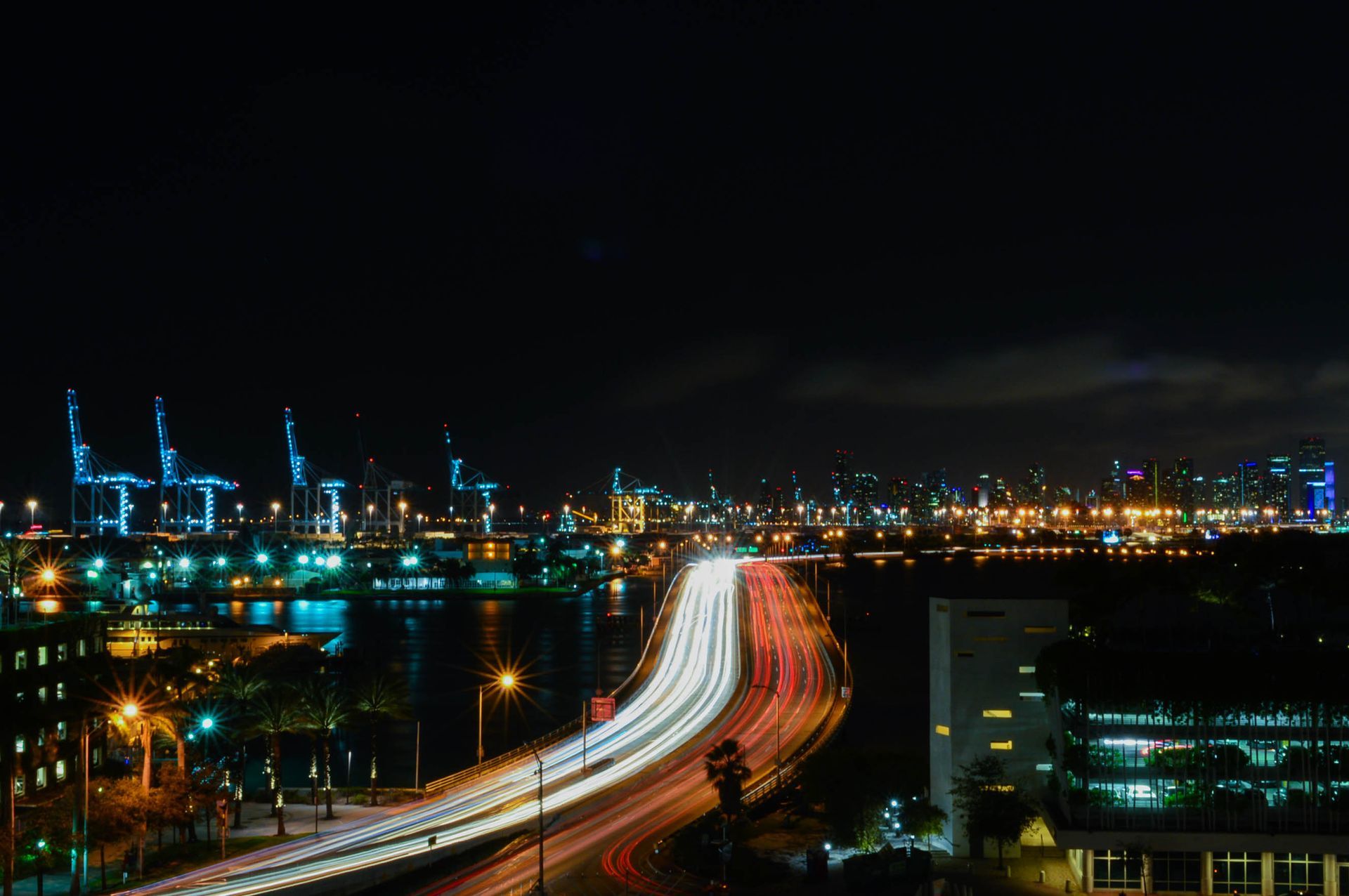 One of many bridges into South Beach, with views of Downtown Miami in the background.